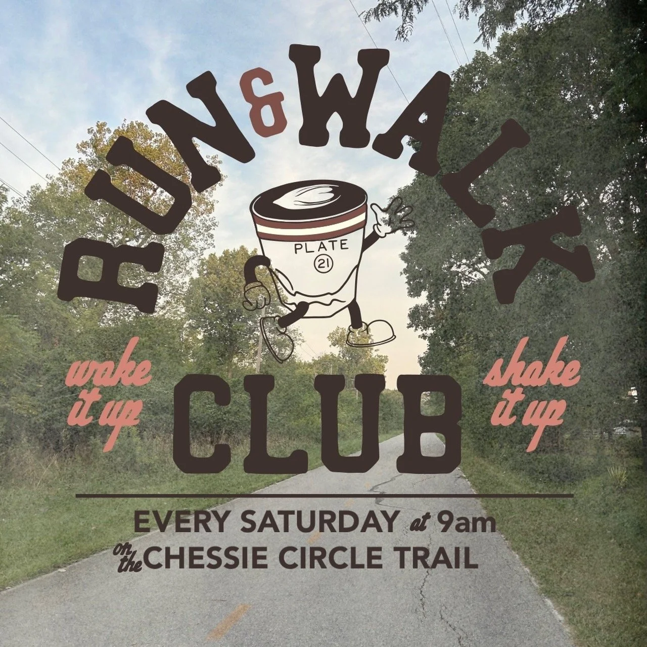 We meet in front of Plate 21 (3664 Rugby Drive, Toledo, Ohio) every Saturday morning at 9am and head out on the Chessie Trail! It is a paved Metroparks Toledo bike path that goes behind our shop to River Road; we walk/run to River Road and then back to the shop which is about 3.2 miles in entirety.